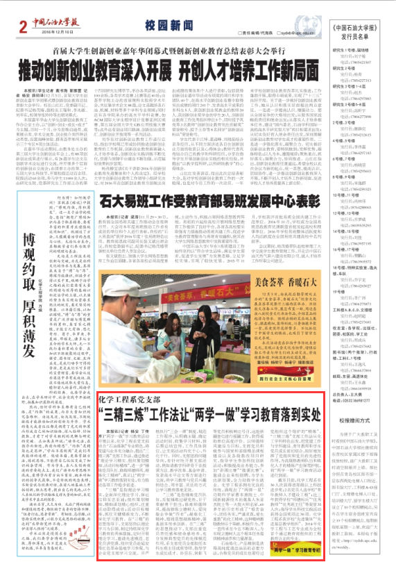 “两学一做”学习教育活动开展以来,化学工程系党支部结合“石油炼制”专业特色,将党建与业务充分融合,提出“三精三炼”支部工作法,通过推进“理论学习精实、组织策划精细、活动目标精准”,进一步“锤炼党员队伍、修炼师德师风、凝练化工精神”,真正让“两学一做”学习教育落到实处,有力推动各项工作稳步前进。