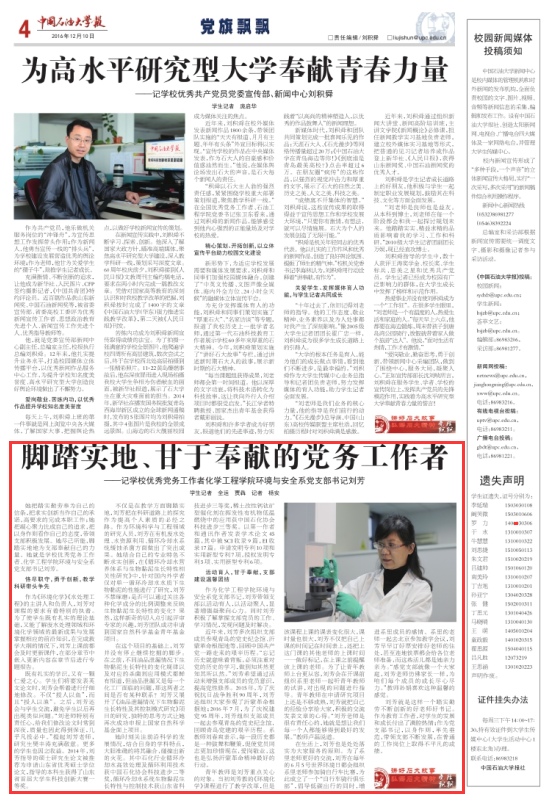 她把踏实勤劳奉为自己的信条,把求实创新当作自己的承诺,高要求的完成本职工作;她把凝心聚力比成自己的追求,把以身作则看作自己的态度,带领支部积极发展。她尽己所能,脚踏实地地为支部奉献自己的力量。她就是学校优秀党务工作者、化学工程学院环境与安全系党支部书记刘芳。