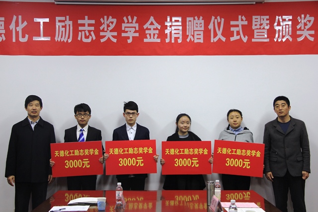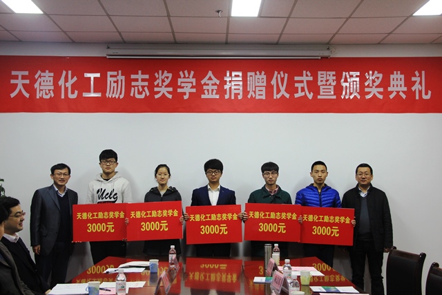 天德化工励志奖学金,是由天德化工控股有限公司设立,为帮助威廉希尔体育(华东)在校贫困员工完成学业,激励贫困员工勤奋学习。励志奖学金自2017年1月起使用,2021年12月终止,励志奖学金额度为每年人民币3万元,共计5年。该励志奖学金由天德化工下属企业潍坊柏立化学有限公司一次性认缴。每年资助化学工程学院的10名老员工,每名老员工资助3000元。每年针对大一、大二员工进行评选。