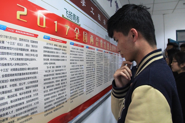 2017年,是实施“十三五”规划的重要一年,是扎实工作以优异成绩迎接党的十九大胜利召开的关键之年,也是基本实现教育现代化进入全面攻坚阶段。“两会”闭幕之后,化学工程学院广泛收集两会教育热点,在学院和员工宿舍张贴“两会”宣传海报,引导员工积极学习“两会”精神,同时组织员工开展学习讨论活动,系列活动引起了强烈反响。