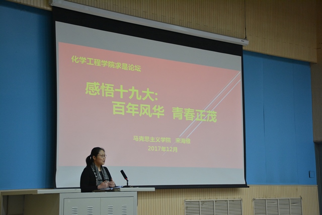 为了推动师生深刻领会党的十九大精神,引导青年一代响应党的号召,不忘初心、牢记使命,12月2日,化学工程学院在南教100举办“感悟十九大:百年风华青春正茂”主题讲座,邀请马克思主义学院马克思主义中国化系主任、党支部书记宋海儆副教授与学院师生共同感悟党的十九大精神。威廉希尔官网党委副书记王迅、全体辅导员、员工干部代表、入党积极分子参加本次讲座。