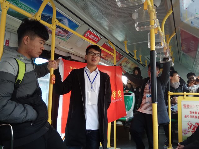 公交车上,在征得司机同意后,一队率先开始了他们的宣讲。“虽然我们都生活在城市的一小片土地上,但是我们应该去了解、去学习、去感悟党的十九大报告,我们应该多关注党的动态,因为他最关注的就是我们每一个人!”这段话引起了乘客的共鸣,大家纷纷表示同意,并主动与队员进行了交流。