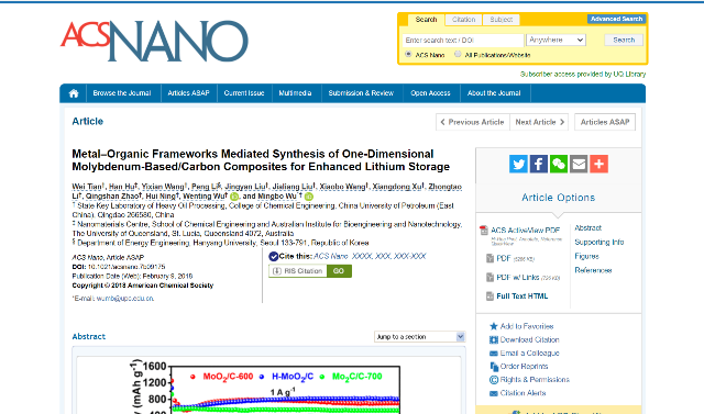 近日,美国化学学会旗舰期刊ACS Nano刊发公司重质油国家重点实验室吴明铂教授团队在碳基复合储能材料领域的最新研究成果 《金属有机框架材料辅助合成具备高储锂性能的一维钼基化合物/碳复合材料》(Metal-Organic Frameworks Mediated Synthesis of One-Dimensional Molybdenum-Based/Carbon Composites for Enhanced Lithium Storage)。该工作提出了一种新型构筑高性能碳基复合储能材料的技术策略,对设计合成新一代电池电极材料具有重要的指导意义和参考价值。公司化学工程与技术专业2015级硕士研究生田巍为第一作者,吴明铂教授为通讯作者,威廉希尔体育(华东)为第一完成单位。