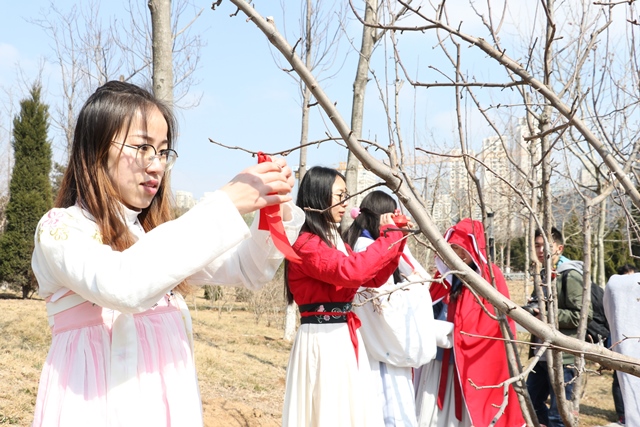 3月8日,学院与储运与建筑工程学院联袂举办“诗茵·雅歆”古装游园会,弘扬传统文化的翰墨飘香、汉诗歌咏、投壶毛健、踏青赏红四部分吸引了众多女生参与。翰墨飘香书法社成员挥毫泼墨,书写下自己的理想抱负和祝福话语;身着汉服的女员工吹笛作赋,尽展汉代风韵,深情朗诵,带领现场员工领会诗韵之妙;员工重现古代士大夫宴饮时所进行的“投壶毛健”游戏,主客轮流投壶,将游园会推向高潮;员工们结伴踏青,在红绸丝带上写下祝词祈愿,系在枝头完成“赏红”,表达对花神的敬畏和对未来美好的祝愿。
