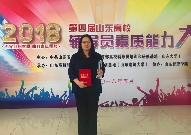 5月11日至14日,第四届山东高校辅导员素质能力大赛在济南举行。公司辅导员窦雅琴荣获特等奖,同时获得参加2018年全国高校辅导员素质能力大赛决赛资格。