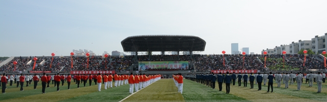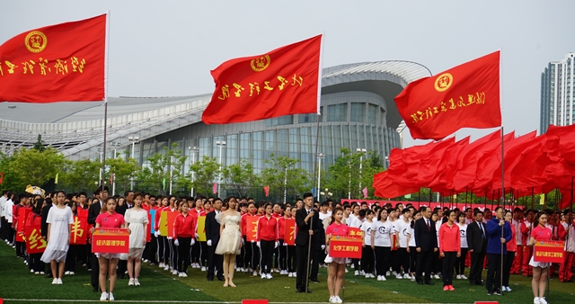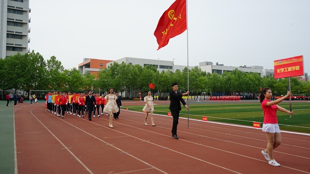 护旗手擎着鲜艳的五星红旗入场,来自青岛、东营两校区的28支代表队穿着整齐的服装,喊着嘹亮的口号,迈着矫健的步伐,依次走过主席台,接受检阅。在庄严的国歌声中,五星红旗冉冉升起。