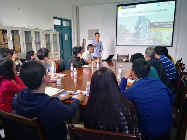 段晓光博士做了题为“碳基纳米材料在环境催化中的应用和机理研究(Application of Nanocarbons in Environmental Catalysis and Mechanistic Studies)”的学术报告。段博士在分析不同高级氧化技术在水处理应用前景的基础上,围绕过硫酸盐高级氧化技术(Persulfate-AOPs)展开交流。在基于石墨烯材料基础上,开展了非金属N、S元素的掺杂提高催化效率的系列研究。相对于传统的Fenton氧化技术,该技术反应效率更高、pH适用范围大、活性组分寿命更长,具有广泛的应用前景。