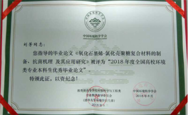 本次评选工作是由教育部高等学校环境科学与工程类专业教学指导委员会与中国环境科学学会联合组织,面向全国环境科学与工程类专业的本科毕业生征集作品,包括环境科学与工程、环境工程、环境科学、环境生态工程、环保设备工程、资源环境科学、水质科学与技术等专业,目的是为不断提高环境科学与工程类专业本科生培养质量,提高员工理论与实际相结合和解决复杂环境问题的能力,为我国环境保护事业输送更多高质量人才。经专家组初审、复审和终评,最终评出60篇“2018年度全国高校环境类专业本科生优秀毕业设计(论文)”作品,其中优秀毕业设计24篇,优秀毕业论文36篇。由公司报送的毕业论文《氧化石墨烯-氯化壳聚糖复合材料的制备、抗菌机理及其应用研究》,荣获优秀毕业论文奖。