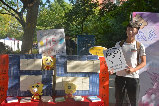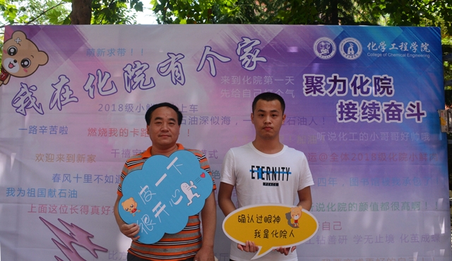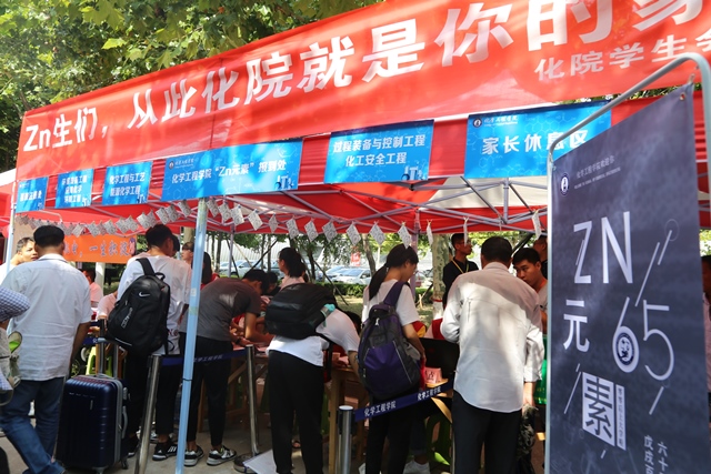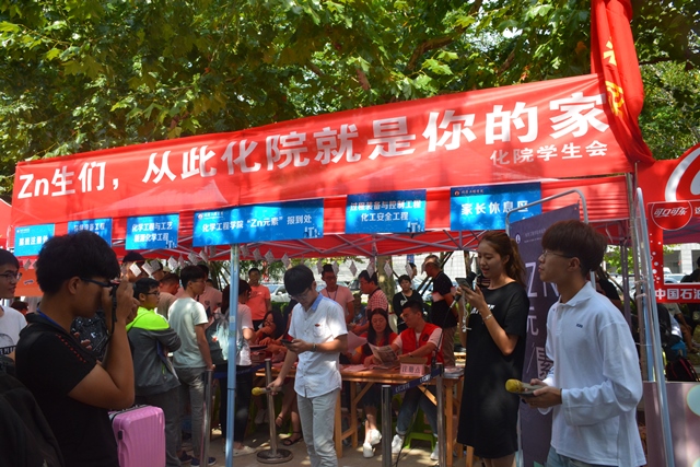2018年恰逢学校65周年庆,学院用书籍摆出“65”的字样,营造书香氛围;“喜迎千禧少年,传承薪火化蕴”的对联表达了对新生的期望。优秀员工墙吸引了众多家长与新生驻足观看,通过优秀典型激励新生发奋图强,创造美好未来。学院还在迎新点设立了家长休息区,为家长答疑解惑,让其体会到学院的贴心。另外,学院迎新点突出“我在化院有个家”主题,设立迎新主题海报和主题合影墙,欢迎“Zn”元素来到化院这个大家庭,聚力化院,接续奋斗。
