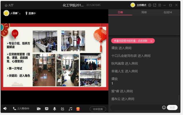 1月18日中午,化学工程学院2018级召开网络家长会,旨在促进家校联系,使员工家长了解子女学业及在校表现,了解学校、学院发展情况。会议由2018级辅导员刘伟主持,兼职辅导员王玉娟及百余名家长参加。