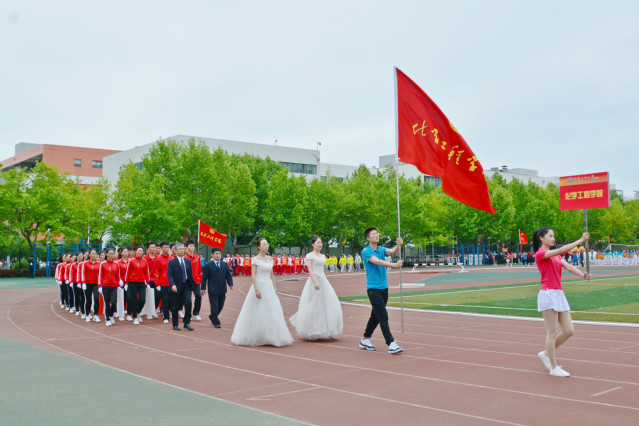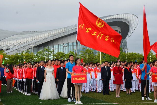 化学工程学院代表队在经理杨朝合和工会主席杜峰同志的带领下走过主席台。从炼制系到化工学院,一辈辈化院人不忘初心、牢记使命,在石油科教的道路上砥砺前行,在扬帆起航的新时代携手共进。他们迈着铿锵有力的步伐,高举着象征化学工程学院研究领域的“碳”和“氢”,用飒爽的英姿展现着化院人永争第一的决心!