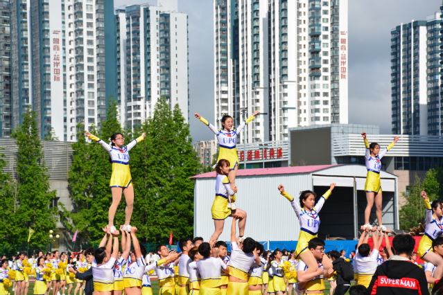 公司员工参与啦啦操表演被托举 魏孟吉摄影