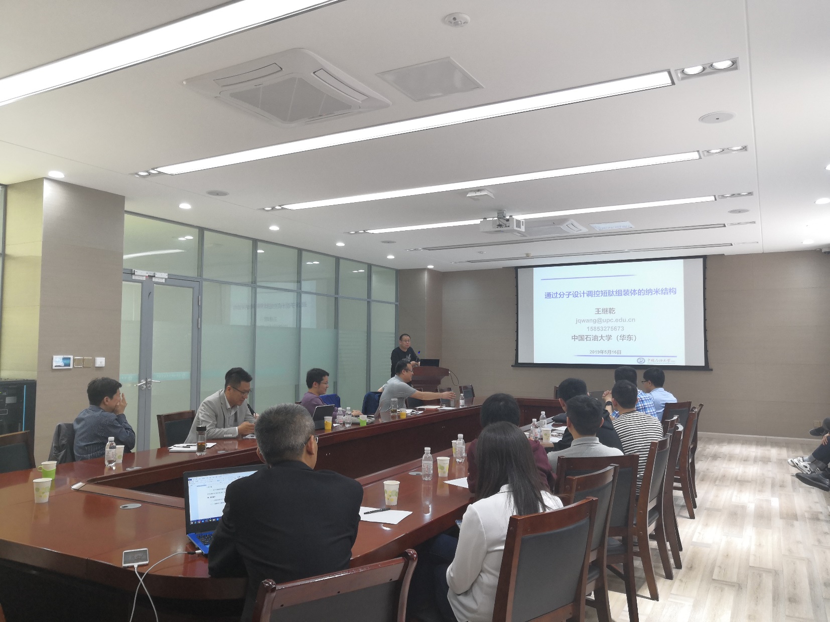 会上,王继乾教授、柴永明副教授、金鑫副教授分别作了 “通过分子设计调控短肽组装体的纳米结构”、“重质油国家重点实验室整体科研情况”、“Nanocatalysis for Biomass Conversion to Chemicals”的学术报告。报告详细介绍了公司在生物材料、石油化工、生物质化工等方面的研究进展。会后双方代表就报告中的热点及难点内容进行了细致的交流,在石油化工、功能纳米材料以及可再生能源领域的合作达成了初步的意向。