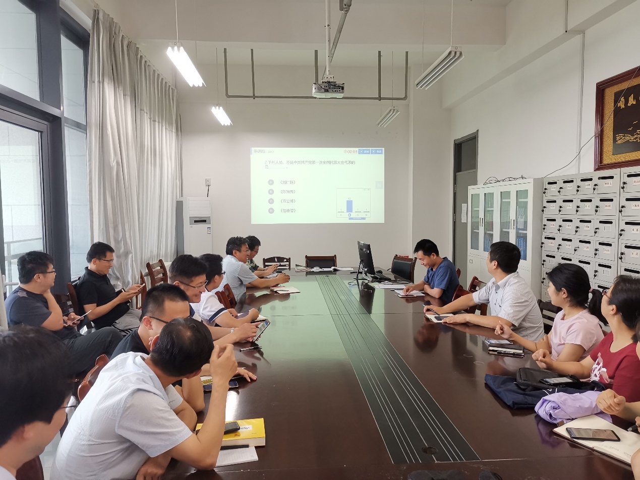 会议伊始,左海强带领支部全体党员同志举起右臂重温了入党誓词,宣誓活动再次唤醒了在场每一位党员入党初心。活动结束后,左老师主持学习了《习近平新时代中国特色社会主义思想学习纲要》、《6月份党支部组织生活意见》等相关内容。值月党员王宗明以微党课形式带领大家回顾了中国共产党的成立和发展,指出战争实践证明了中国共产党的伟大,中华复兴离不开中国共产党的领导,要坚定支持中国共产党的领导,走稳定发展的道路。微党课学习结束后,大家利用雨课堂平台即时在线答题,巩固学习效果。