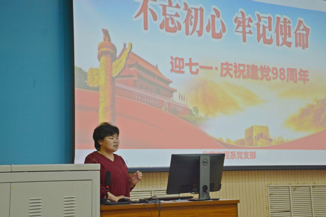 接着,化工系党支部书记丁传芹主讲了“迎七一・庆祝建党98周年”主题党课,她通过回顾中国共产党的发展历史,分析党逐步发展壮大的原因在于党始终坚守为中国人民谋幸福、为中华民族谋复兴这个初心和使命,义无反顾向着这个目标前进,从而赢得了人民衷心拥护和坚定支持。新时代发展背景下,需要每个党员结合自身实际,“不忘初心、牢记使命”,通过开展自我革命,找差距、抓落实,用实际行动支持党的建设、为国家发展贡献力量。