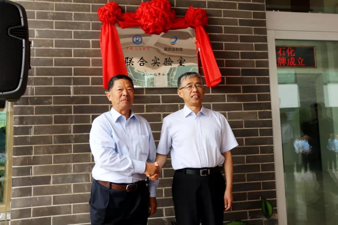 7月11日,威廉希尔体育(华东)化学工程学院与山东清源集团共建“特种油联合实验室”揭牌仪式在沂水清沂山石化公司举行。山东清源集团董事长马之清、学院经理杨朝合教授共同为联合实验室揭牌。