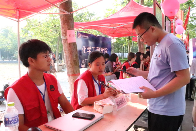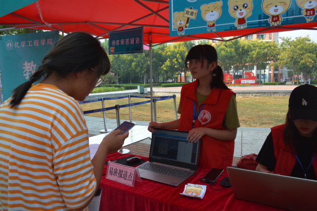 公司迎新点分专业设置了报到通道,那里的工作人员热情地为新生办理报到手续,指引新生找到宿舍并领取钥匙。学院还在迎新点设立了家长休息区、教师答疑区和化院特色背景墙,其中,家长休息区供提供饮水服务,并为家长们互相交流和短暂休息提供了场所;教师答疑区由班主任和辅导员轮流值班,为前来咨询的新生和家长答疑解惑;化院特色背景墙成为来往新生与新生、新生与家长合照留念的热门地点。