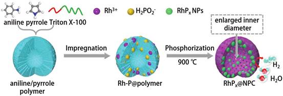 针对上述问题,团队成员董斌副教授、迟京起博士创新性地设计了有机-无机限域结合协同磷化热解策略,成功制备了包覆于超薄碳壳中的磷化铑(RhPx@NPC)纳米结构。首先,通过制备高分散的Rh/P-polymer 前驱体纳米球,对催化活性位进行高度分散和保护,进而通过独特的限域磷化热解还原,一步实现多重优势:(a) 均匀分散的超细RhPx纳米颗粒包覆于超薄碳壳中;(b) 原位磷化还原刻蚀碳层生成超薄碳壳,极大提高催化剂比表面积,同时产生丰富的介孔;(c) 构筑N,P杂原子掺杂超薄碳壳,为催化剂提供了良好的导电性和保护层。该实验思路下制备的RhPx@NPC催化剂表现出酸、碱、中性宽pH范围良好的产氢活性和稳定性,该合成策略有望应用于其它杂原子掺杂磷化物高效电催化剂的制备。
