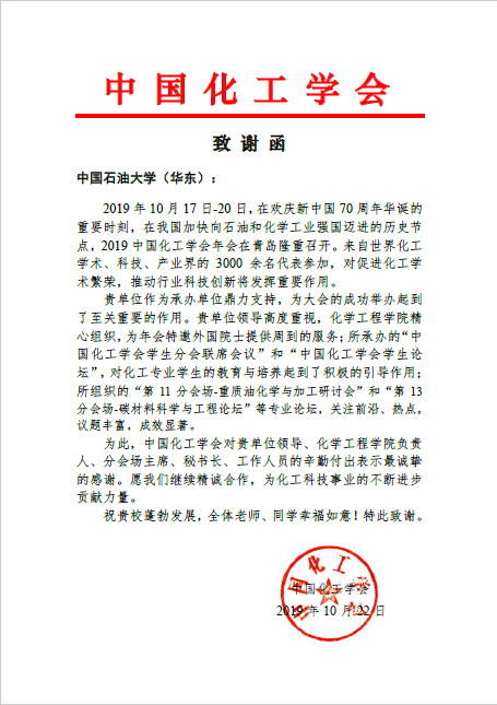 10月18日,2019中国化工学会年会在青岛召开。大会由中国化工学会、山东省科学技术协会共同主办,公司与中国石化青岛安全工程研究院、青岛科技大学、中国石化青岛石化公司、中国石化青岛炼化公司、青岛市科学技术协会等单位共同承办。作为第一承办单位,公司化学工程学院收到中国化工学会致谢函。