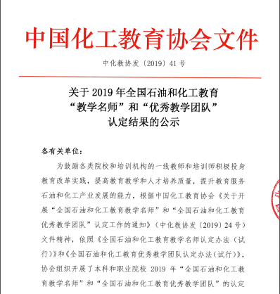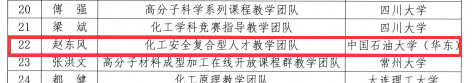 2019年12月5日,全国石油和化工教育“教学名师”和“优秀教学团队”颁奖仪式在浙江绍兴举行。中国化工教育协会于11月18日公布了全国石油和化工教育“教学名师”和“优秀教学团队”的认定结果,认定赵东风教授为“全国石油和化工公司产品名师”,认定赵东风教授带领的“化工安全复合型人才教学团队”为“全国石油和化工教育优秀教学团队”。