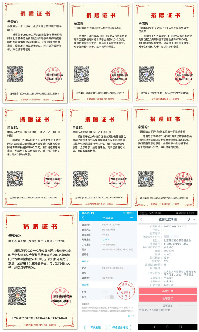 疫情发生以来,多个党支部募集“特殊党费”、多个班级捐出先进集体奖学金、班费等,师生纷纷捐款捐物,为抗击疫情贡献爱心和力量。化院研1909班募集1240元、本研一体化(化工类)1701班募集1000元、应化1804团支部募集团费770元、化工(菁英)1707班捐出班费800元、化工1805班捐出班费500元、环境1901班募集600元,刘家铭、唐嘉婧等百余名师生将10元至1000元不等的奖学金、压岁钱捐出,通过湖北省慈善总会、韩红爱心慈善基金会、微公益等平台将爱心传递到了武汉,部分师生收到了来自募捐平台的“捐赠证书”和诚挚的谢意。其中,蒲公英党员先锋队在全院研究生中发起“武汉加油”爱心捐款活动,共募集善款21879.71元,将通过武汉大学教育发展基金会驰援武汉。先锋队在公开信中对同学们表示诚挚感谢,并表示将一直跟进募捐款的流向,尽最大努力将同学们的爱心送到武汉最有需要的地方。化工系第一员工党支部捐出党费1870.80元,其党支部书记表示,听闻疫情防控工作需要大量购置医疗及防护物资,支委成员线上开会商议讨论,组织支部党员为疫区同胞捐款捐物,在特殊时期募集“特殊党费”,为打赢这场肺炎疫情防控战献出自己的一份力量!