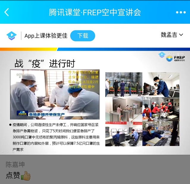 2月14日上午9:30,福建联合石化2020年春季招聘空中宣讲会威廉希尔体育(华东)专场在腾讯课堂上线,化学工程学院组织2020届毕业生及部分员工家长参与交流互动。宣讲会由福建联合石化郭立华先生主持,吴小霞女士等企业方相关负责人出席。