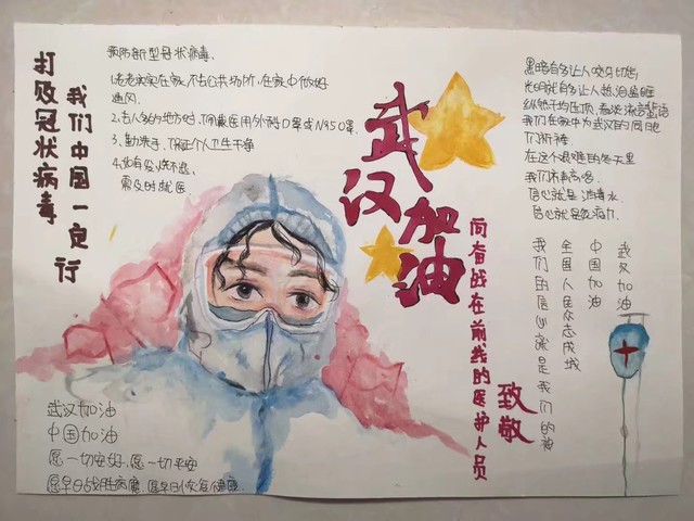 一句句祝福的话语,一幅幅表达浓情深意的画作,一首感人泪下的诗歌,一曲令人回味的歌曲,架起了一座战“疫”的暖心桥,跨越了空间的阻隔,将人们的心连在了一起。化工研究生第三员工党支部积极开展线下活动,组织支部成员开展“武汉加油”画报、诗歌、照片、歌曲等征集活动,收到了许多感情真挚、寓意丰富的作品。支部党员李子涵指导小朋友制作了疫情漫画,青涩的笔触描绘出一幅幅全国人民团结一心抗击疫情的画面,传递着必胜的决心与信心。支部党员管承东在创作的诗歌《致敬奔赴前线的医护人员》中写道:“这是一场苦战,但胜利终将会来临。加油武汉,加油中国!”
