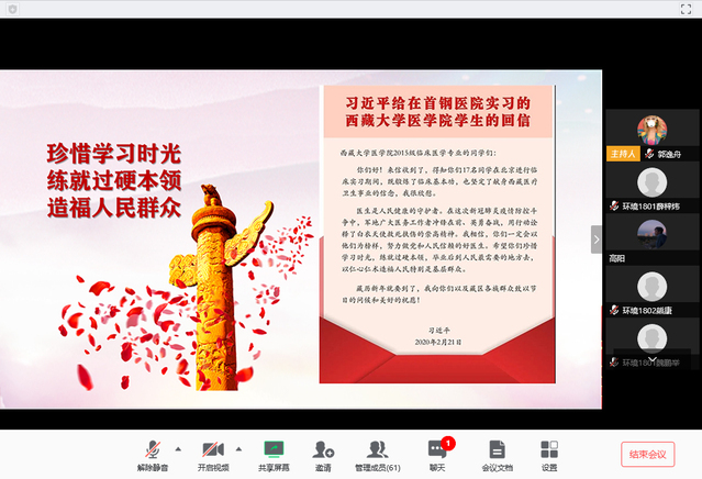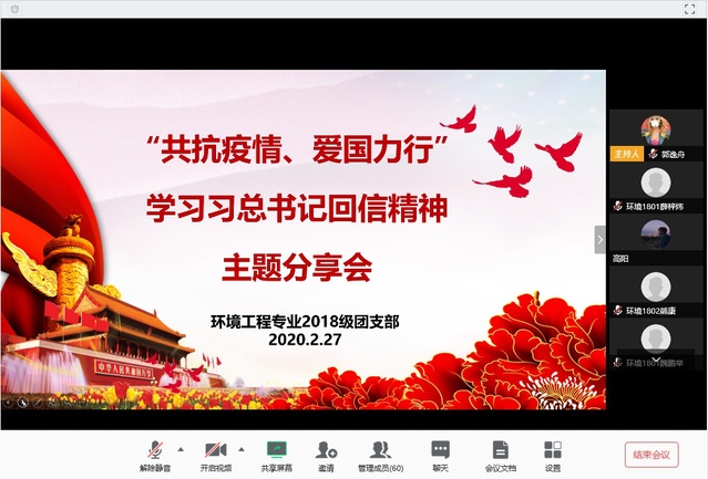 自肺炎疫情爆发以来,学校各级组织高度重视防疫工作。为助力国家战胜疫情,增强疫情防控意识,提升战胜疫情的信心,进一步做好疫情防控工作,2月27日,环境1801团支部、1802团支部开展了“共抗疫情,爱国力行”学习习近平总书记回信精神线上主题分享会。本次会议由环境1801团支部书记纪欣蕾主持,环境工程专业2018级全体员工参加。