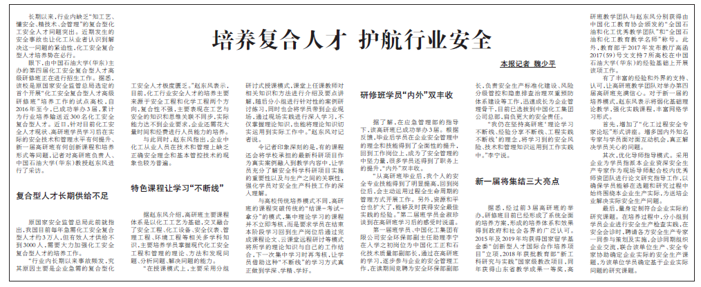 近日,化工安全复合型人才高级研修班负责人、威廉希尔体育(华东)教授赵东风就化工安全复合型人才培养工作接受中国化工报的采访。采访主要围绕目前化工安全人才现状、高研班学员学习后在实际的安全技术和管理水平有何提升、新一届高研班有何创新课程和培养形式等问题展开。该报道以《培养安全复合人才 护航化工行业安全》为题,并刊登在中国化工报化工安全版面。现将原文转载如下: