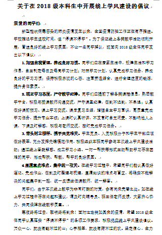 线上倡议促学风。2018级年级工作组向全体同学发出线上学风建设的倡议:值此特殊时期,作为新时代的青年员工,同学们应加强自我管理,养成良好习惯;端正学习态度,严守教学纪律;带头树立榜样,携手共克难关;厘清重点难点,集中统一攻关。线上学风建设从各个方面对同学们进行激励与引导,为年级优良学风建设打下了坚实的基础。