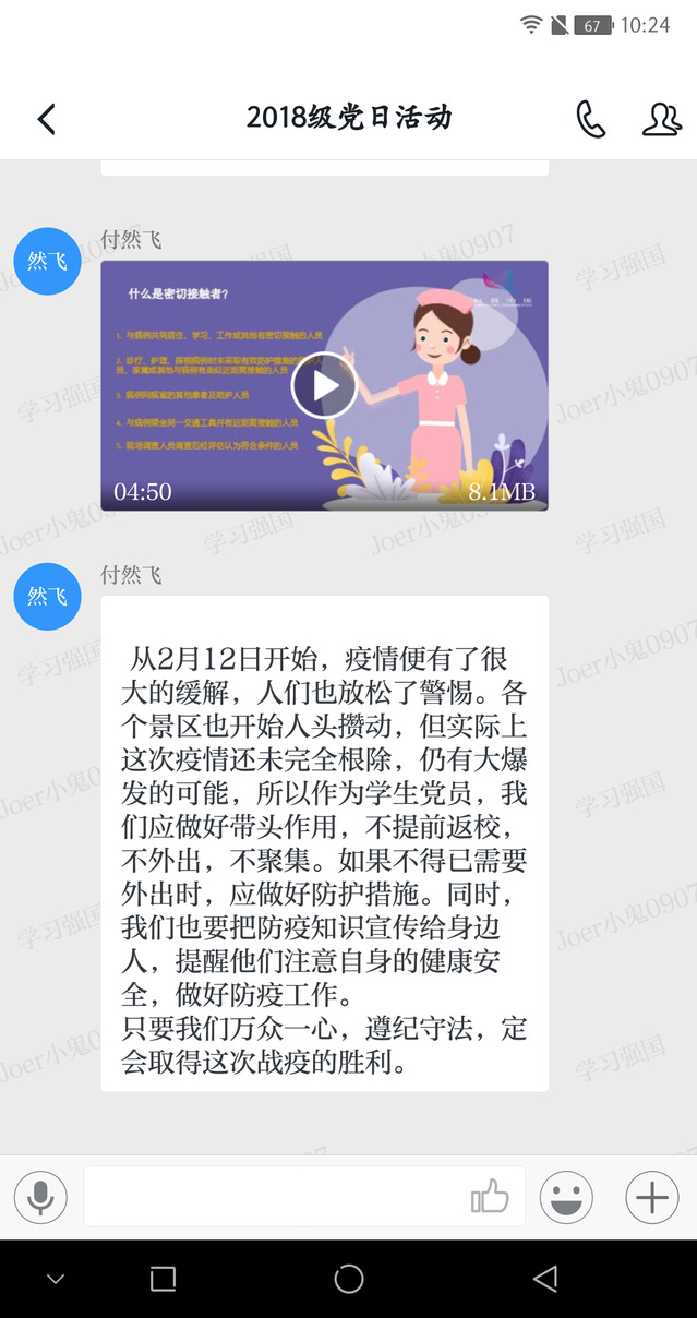 加强学习。2018级员工党员、入党积极分子多次召开线上会议学习习近平总书记的重要讲话和指示精神,并通过多途径、多形式加强学习。员工党员付然飞和刘镇毅通过精心准备的微党课讲解,帮助大家学习了解了有关疫情防控的基本知识以及党和学校的最新政策通知,以更好地应对当前的疫情形势并做出表率。刘镇毅表示:“在家中我们不能虚度光阴,在做好自我防护的同时,还要继续加强学习,提升自我,增强责任感。”