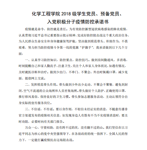 郑重承诺。2018级全体党员及入党积极分子在这个特殊时期,通过QQ空间、微信朋友圈等媒体平台做出承诺,坚决做到模范带头、积极作为、不畏艰难,努力担当防控疫情斗争第一线的党旗“护旗手”。同时他们号召身边广大青年员工共同行动,为人民群众生命安全和身体健康保驾护航。