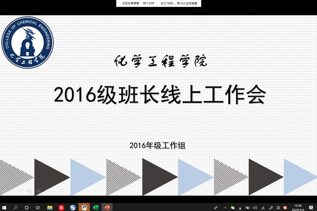 3月5日下午4时,化学工程学院2016级召开线上工作会议,总结前期疫情防控相关工作,并对下一阶段重点工作进行安排。会议由2016级辅导员魏孟吉主持,全体班长参加会议。