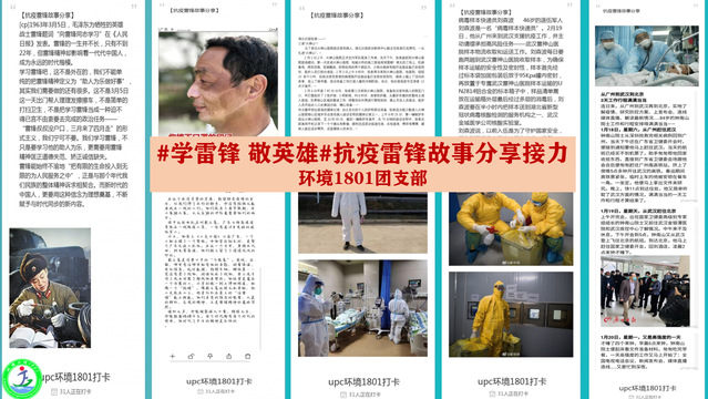 讲雷锋故事。从故事中传承雷锋精神,接续奋斗。应化1802团支部通过讲述雷锋精神传承者的故事,解读新时代雷锋精神的内涵;环境1801团支部在线上举行了抗疫雷锋故事接力活动,支部成员接力分享新时代雷锋故事,进一步感悟如何传承雷锋精神。其他团支部也分享了抗“疫”斗争中的一个个雷锋故事,让人动容。本研一体化班员工张慧分享完后感慨道:“在这些志愿者身上可以看到在中国大地上传承不断的雷锋精神。他们既是危难时刻的最美逆行者,也是新时代的道德践行者。”