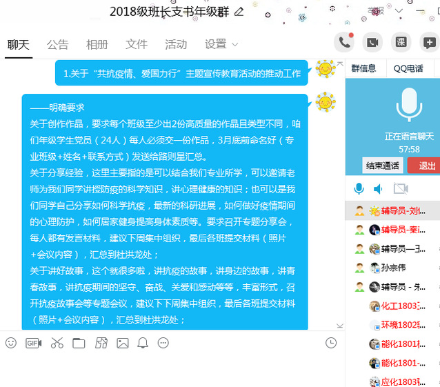 3月12日晚,2018级召开了团支书工作会议,进一步推动年级“共抗疫情、爱国力行”主题宣传教育活动开展,加强学风建设。会议由2018级辅导员刘伟主持,辅导员朱景顺、秦政及全体团支书参加会议。