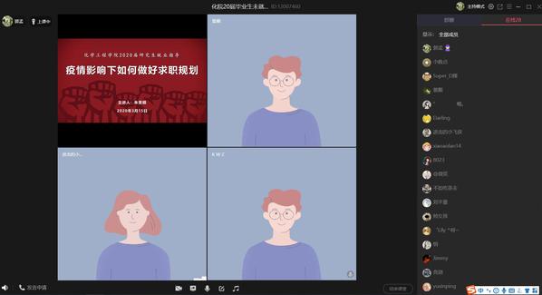 朱景顺老师从对比本科和硕士毕业生对网上求职的适应程度和主动程度入手,分析了研究生毕业生群体求职过程中的优势和劣势,并对近期国务院发布的2020届高校毕业生最新就业政策进行了解读,鼓励大家要勇于扎根基层,到国家能源发展战略最需要的地方去奋斗。随后,朱老师建议有升学或考公意向的同学要两手准备,尤其要有目标、有筛选、有备选的去选择适合自己的院校或单位,并且要多关注网上空中双选会和国聘行动招聘会,同时,朱老师也推荐了智联招聘等网络招聘平台,建议同学们把握好就业黄金期,积极主动的求职。最后,朱老师就参与此次在线指导的同学们提出的求职问题进行了耐心的解答。