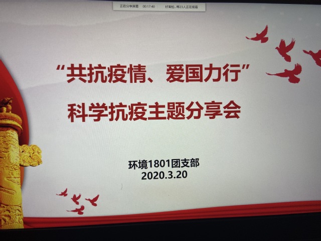 各团支部结合实际情况,积极发挥学科和专业优势,分享思考体悟,传播健康理念、传染病防控知识以及心理健康、锻炼运动等知识。化工1801团支部积极分享科学防疫知识、居家健身小技巧,互相鼓励,团结一致,共抗疫情;本研1801团支部结合专业所学讨论有效的消毒方法、酒精的制备方法、口罩材料及工艺流程等方面的知识;应化1801和1803团支部从如何科学防疫、疫情科研进展、做好心理防护等方面进行了交流;环境1801团支部则从专业出发,探讨环境工程学科在疫情防控中所能做出的贡献,明确责任和使命,扎实学习,砥砺奋斗,增强本领。其他团支部也根据实际需要,邀请专业老师开展了经验分享会。正如能化1801团支部的房欣同学所说:“我们有信心在党和国家的统一领导和部署下,齐心协力,众志成城,取得新型冠状病毒肺炎疫情防控战的全面胜利。”