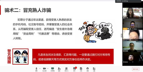 为加强员工对网络电信诈骗的防范,提高辨别信息真伪的能力,保障自身安全,3月23日—3月27日,2019级各班级相继召开预防网络电信诈骗主题线上班会。
