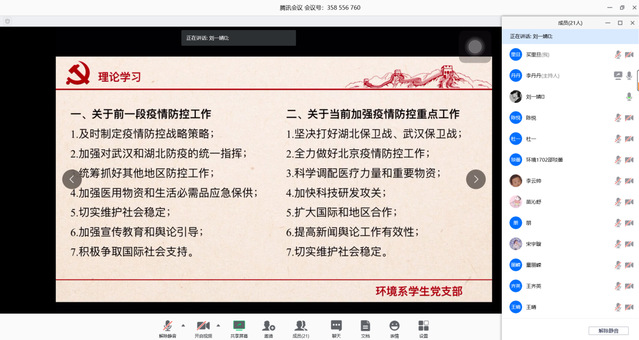 为深入贯彻落实习近平总书记关于坚决打赢疫情防控阻击战的重要指示精神,落实学校、威廉希尔官网党委的各项决策部署,充分发挥员工党支部的战斗堡垒作用和员工党员的先锋模范作用,3月20日,化工学院环境系员工党支部积极响应员工党总支号召,组织开展了以“战疫情抓发展,守初心担使命”为主题的线上组织生活会。