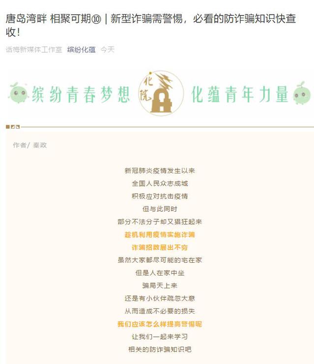 公司以预防网络电信诈骗安全教育为重点,结合疫情期间新型诈骗案例,通过QQ群、微信公众号等平台推送预防网络电信诈骗知识,加强宣传教育,提高员工安全防范意识。辅导员和班主任在年级内积极开展以“预防网络电信诈骗,提高安全防范意识”为主题的安全教育,共同做好员工的教育提醒工作,教育员工在日常生活中提高警觉,增强防骗识骗能力。学院积极组织各班级开展安全主题教育班会,通过分享个人受骗经历、观看防诈骗视频、开展防疫网络诈骗教育问答等方式,大力宣传防骗识骗安全知识,有效提高员工预防和应对网络电信诈骗的能力。