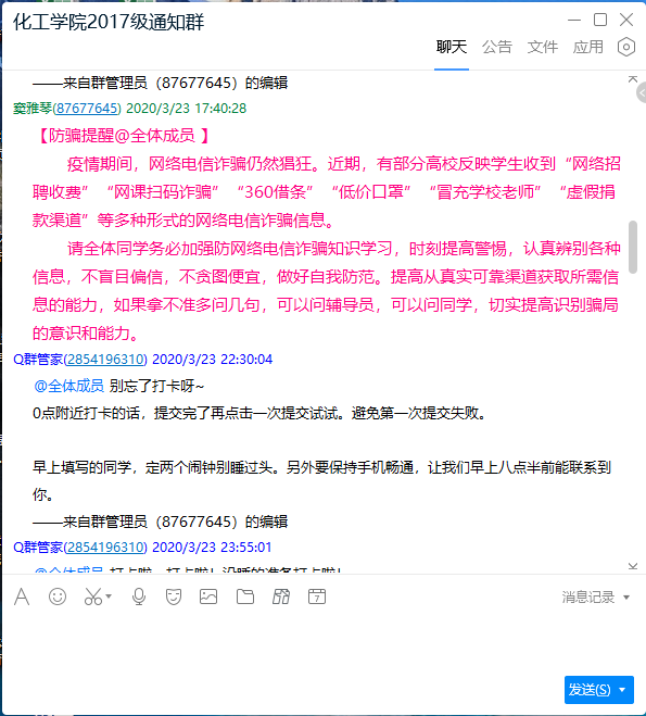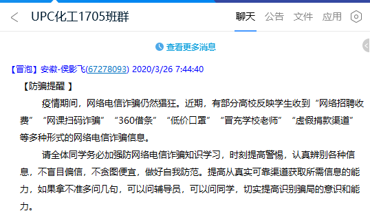 辅导员在年级群中推送防诈骗提醒