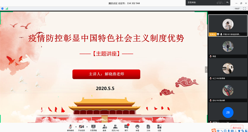 为引导广大团员青年坚定“四个自信”,深刻理解“全球抗疫中的中国担当”,增强打赢疫情防控阻击战的决心和勇气,5月5日晚,化学工程学院通过腾讯会议举办了《疫情防控彰显中国特色社会主义制度优势》专题讲座。本次讲座由马克思主义学院解晓燕老师主讲,学院团委书记郭孟以及240余名员工参加了此次讲座。