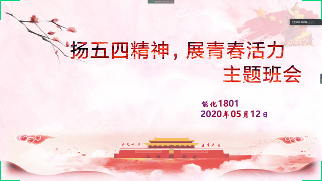 为增强青年员工的爱国情怀,激励员工展现青春风采,5月12日,能化1801班举行“扬五四精神,展青春活力”线上主题班会。会议由班长杜洪龙主持,学院副经理刘欣梅、班主任曹美文、辅导员刘伟以及能化1801班全体员工参加此次活动。
