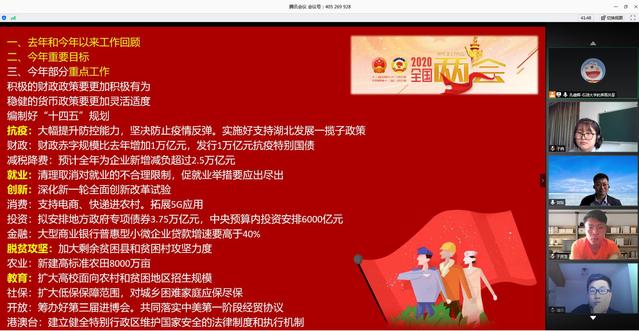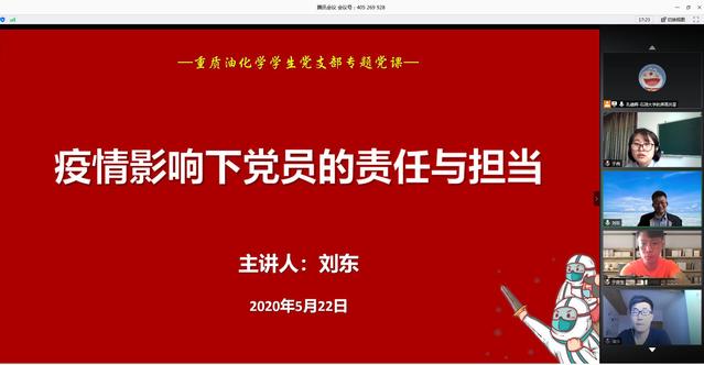在2020年全国两会召开之际,为引导员工党员立足实际,充分发挥党员先锋模范作用,强化党员的担当意识,进一步增进对中国共产党和中国特色社会主义制度的政治认同、思想认同、理论认同、情感认同,5月22日,重质油化学员工党支部以“学两会精神,话党员担当”为主题,通过腾讯会议的形式开展了线上组织生活,同时邀请学院“四联系”工作指导教师刘东副经理讲授“疫情影响下党员的责任与担当”专题党课。会议由党支部书记孔德辉主持,全体支部成员、入党积极分子及入党申请人参加。