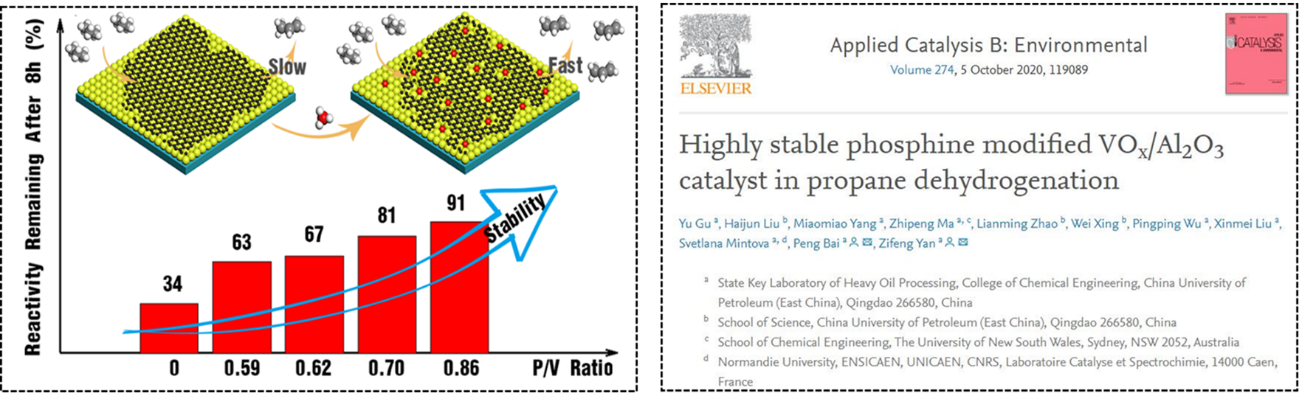 题为《高稳定性磷化氢改性的VOx/Al2O3丙烷脱氢催化剂》(Highly stable phosphine modified VOx/Al2O3catalyst in propane dehydrogenation)的论文发表在Applied Catalysis B: Environmental上。公司博士生顾宇为第一作者,白鹏副教授和阎子峰教授为论文通讯作者。该项工作得到国家自然科学基金、国家重点研发计划专项、中央高校基本科研基金、山东省自然科学基金以及重质油国家重点实验室基金等项目的资助与支持。