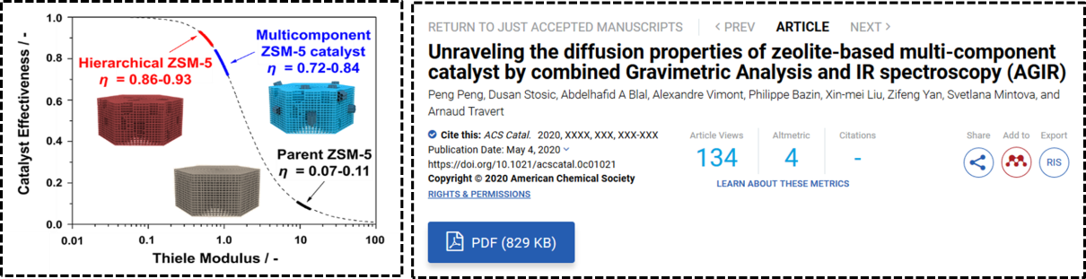 题为《利用重力-原位红外光谱联用技术(AGIR)研究沸石基多组元催化剂的扩散性能》(Unraveling the Diffusion Properties of Zeolite-Based Multicomponent Catalyst by Combined Gravimetric Analysis and IR spectroscopy (AGIR))的论文发表在ACS Catalysis上,并被推荐为封面文章。公司博士生彭鹏为第一作者。公司阎子峰教授和法国国家科学研究中心Arnaud Travert教授为共同通讯作者。该项研究得到国家留学基金委、王宽诚教育基金会、中法分子筛联合实验室、国家重点研发计划、山东省重点研发计划与中国石油炼油催化剂重大专项等基金的资助与支持。