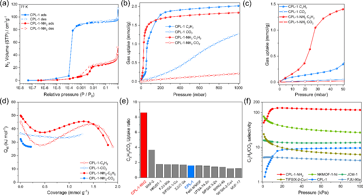 赵学波教授科研团队根据乙炔和二氧化碳在孔道中排布方式和吸附位点的不同,以CPL-1为母体结构,发展了一种全新的吸附位点选择性占据方法实现了乙炔二氧化碳混合气的高效分离。在CPL-1中,C2H2分子主要以侧向(side-on)平行的方式吸附在孔道中,而CO2分子主要以端尾相对(end-on)的方式吸附在孔道中。由于每个晶胞可容纳两个CO2分子但仅可容纳一个C2H2分子,CPL-1对C2H2/CO2的分离效率较低。实验发现,将氨基(-NH2)修饰在CPL-1的孔道中之后,CPL-1-NH2孔道中的氨基成功占据了CO2的吸附空间和吸附位点,使CPL-1-NH2中的每个晶胞最多吸附一个CO2分子。出人意料地是,修饰的氨基降低了骨架与CO2分子的吸附结合能。与此相反,CPL-1-NH2对乙炔展现了更强的结合能力,在极低压力下即可吸附大量乙炔气体。因此,CPL-1-NH2展现了极高的C2H2/CO2分离效率,采用理想吸附溶液理论(IAST)模拟计算得到的常温常压条件下C2H2/CO2选择性为119,是文献中C2H2/CO2分离材料的佼佼者。