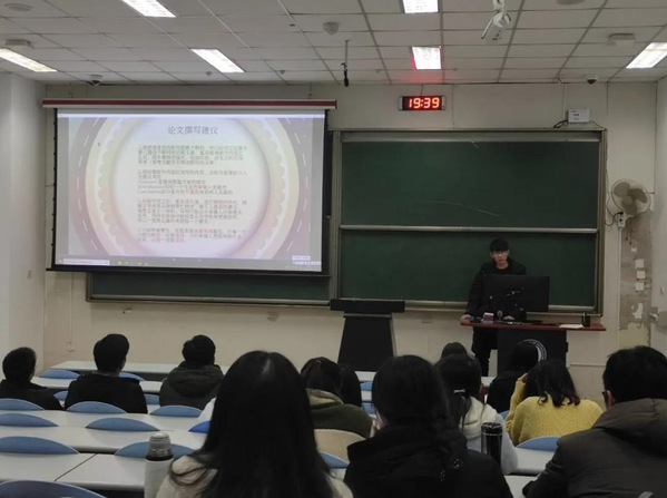接下来是环境工程专业的博士赵树杰师兄为同学们带来了他的看法,与师姐不同的是,师兄从自己发表论文时遇到的种种困难开始讲述,让原本轻松的氛围又严肃了起来,师兄向大家表示多读文章是非常有必要的,同学们纷纷表示赞同,见同学们都有了压力,师兄话题一转又将整场会议的气氛变得幽默起来了,师兄向大家表明了读高水平文章的重要性,从一开始就阅读权威性高的文章为以后的写作将会打下坚实的基础,同学们纷纷鼓掌,表示赞同。
