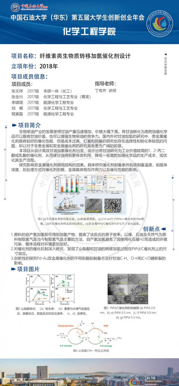 2月5日—14日,学校举办了第五届老员工创新创业年会,本届年会以“智汇青春·开创未来”为主题,经网络投票、员工答辩、专家评审、学校审定等环节,由杜峰副教授指导、2017级员工赵思名负责的“纤维素类生物质C-O键选择性氧化的纳米催化剂设计”项目及由丁传芹老师指导、2017级员工张文祥负责的“纤维素类生物质转移加氢催化剂设计”项目获评“优秀论文”(全校共10项)。由柴永明教授指导、2017级员工陈天舒负责的“基于电解水制氢的原位优品加氢催化体系建构”项目获评“最喜爱的项目”(全校共10项)。