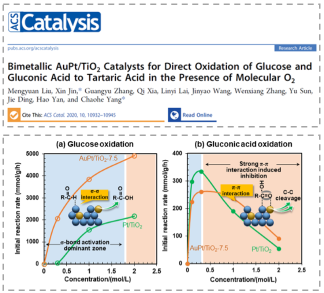 题为《AuPt/TiO2双金属催化剂催化选择性氧化葡萄糖和葡萄糖酸转化为酒石酸》(Bimetallic AuPt/TiO2 Catalysts for Direct Oxidation of Glucose and Gluconic Acid to Tartaric Acid in the Presence of Molecular O2)的论文发表在ACS Catalysis上。公司博士研究生刘梦媛为论文第一作者,杨朝合教授和金鑫副教授为通讯作者。